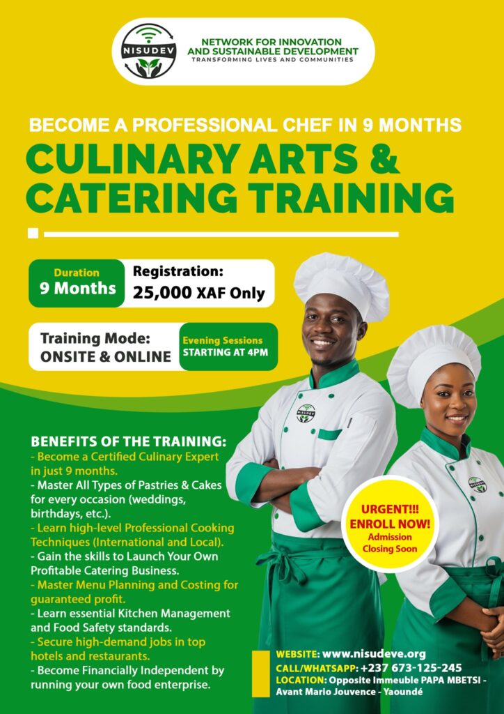 #CulinaryArtsYaounde #ChefTrainingCameroon #DQP #CQP #MINEFOP #NISUDEV #ProfessionalCatering #PastryChef #YaoundeFoodies #VocationalTraining